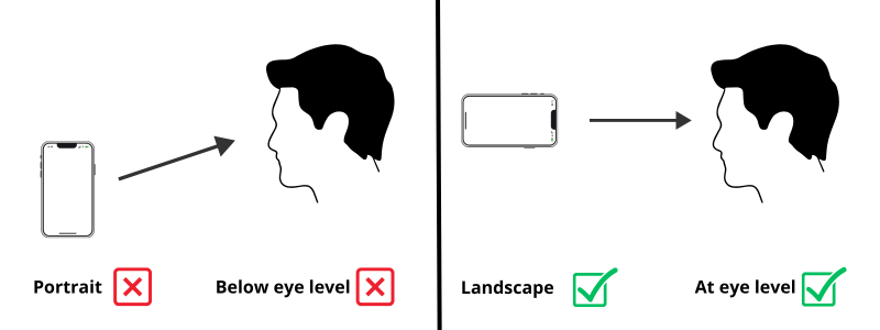 Ensure the camera portion of your device is at eye level (see example). You can use a tripod built for a smartphone or tablet. If you do not have a tripod, consider using a stack of books on a desk or box. Filming in “landscape” (horizontally) is recommended.